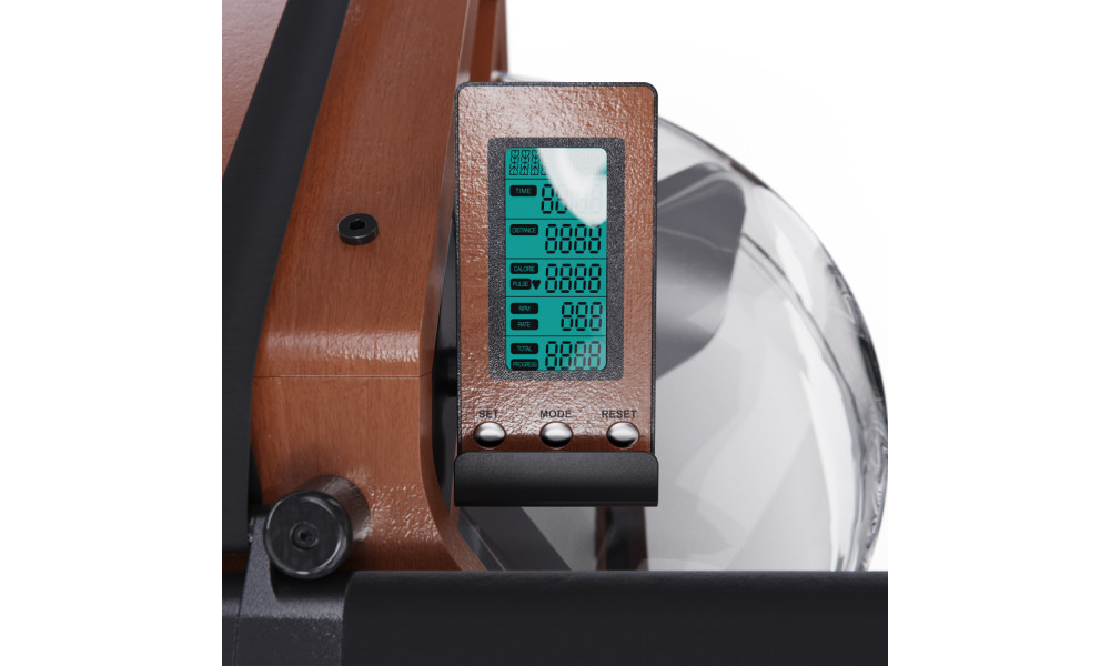 Консоль гребного тренажёра SmartGym имеет 8 уровней регулировки педалей и показывает время, расстояние, калории, пульс и обороты в минуту. Система нагрузки является водной: чем больше вы зальёте в бак воды, тем больше будет нагрузка. Транспортировочные ролики позволяют легко перемещать тренажёр, а его размер в сложенном виде составляет 60 x 56,5 x 210 см.
