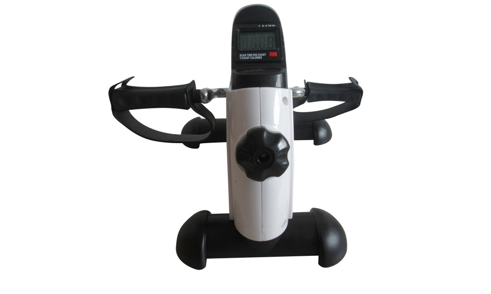 Велотренажер для домашнего использования, с механической системой изменения нагрузки. Подходит для тренировки ног и рук. Регулировка ремней педалей. Компьютер: скан, время, расстояние, обороты в минуту, скорость, калории.